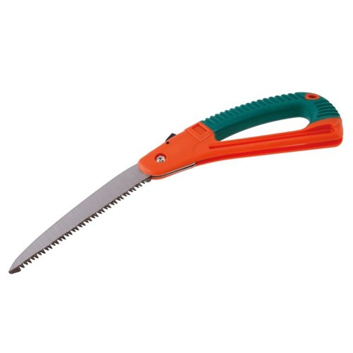 Skládací ruční pilka na dřevo s plastovou pogumovanou rukojetí. Praktická zahradnická pilka je vhodná především k prořezávání větví stromů a keřů. Pila zahradní má vysokofrekvenčně kalené 3x broušené zuby.