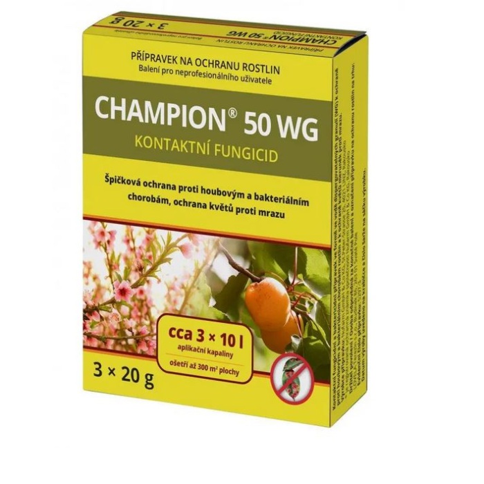 Champion 50 WP obsahuje hydroxid měďnatý, který je fungicid a baktericid s protektivní účinností a širokým spektrem účinku. Champion 50 WP se používá proti plísni bramborové, cibulové, okurkové a révové, proti černi rajčatové, septorióze rajčat a celeru, bakteriákní skvrnitosti okurek, kadeřavosti listů broskvoně, proti ochraně květů meruněk před mrazem, bakteriální spále jablóňovitých u jabloní a hrušení ( je možno použít i ve školách před olistněním ), bílé skvrnitosti listů jahodníku, rakovinné umírání větví u třešní a višní, proti hnědnutí listů ořešáků a puchrovitosti slivoně.