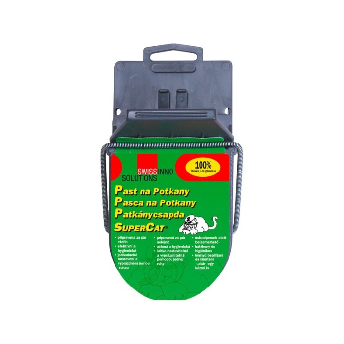 Swissinno SuperCat je přírodní netoxická past, která je velmi lákavá pro potkany. Past se vyznačuje výjimečnou efektivitou odchytu: tisíce uživatelů zmiňují vysoké množství odchytů ve velmi krátké době. Swissino SuperCat je past založená na švýcarském designu s účinným pružinovým mechanismem, který umožňuje odchycené potkany hygienicky odstranit bez dotyku. Past na myši není nebezpečná pro děti: uzavírací čelisti pasti zabijí myš, ale neublíží dětem nebo domácím mazlíčkům. Návnada je připravena okamžitě k použití. Past je možné užít uvnitř i venku. Swissino SuperCat je ideální pomocník pro domácí i komerční použití: závody, kanceláře, farmy, sady, plantáže.