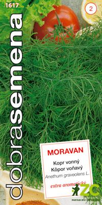 MORAVAN - aromatický, pozdě kvetoucí kopr. Listy jsou husté, tmavé, stříbřitě modrozelené. Má výraznou odolnost proti vybíhání do květu, což prodlužuje dobu sklizně.