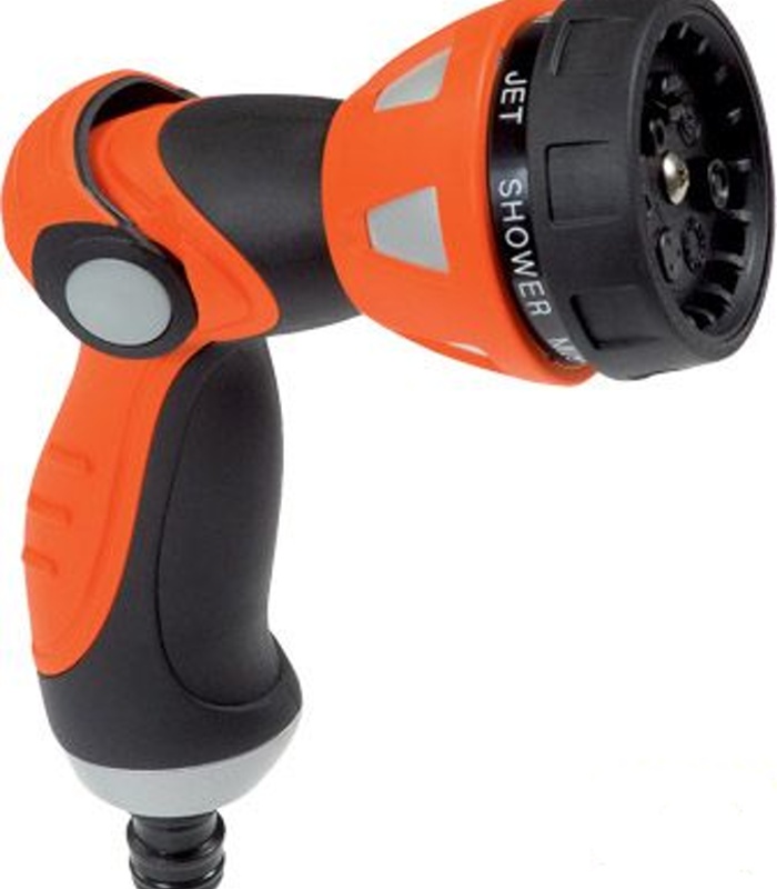Víceúčelová postřikovací kovová pistole s ergonomickým držadlem, pryžovou hlavou, plynulou regulací rozstřiku, jednoduše ovladatelnou vpředu umístěnou aretací se sedmi druhy nastavení rozstřiku (sprcha, perlátor, mlžítko, proud atd.), se skvělým designem a funkční zdatností. Baleno v blistru.