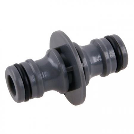 Plastový adaptér se dvěma konci pro rychlé propojení zahradních hadic pomocí rychlospojek.