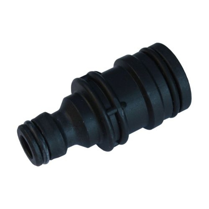Plastový adaptér se dvěma konci pro rychlé propojení zahradních hadic pomocí rychlospojek.