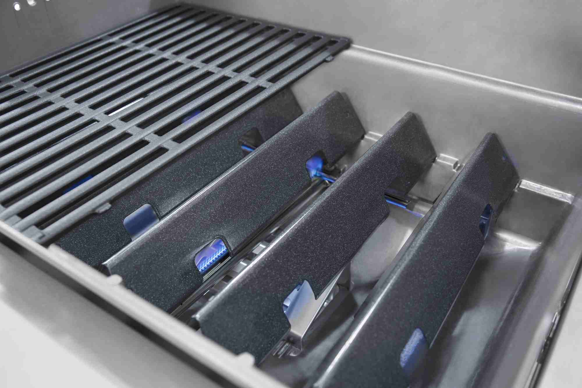 - Flavorizer zachytí odkapávající šťávy, které se odpařují zpět a dávají tak jídlu tu pravou chuť grilování