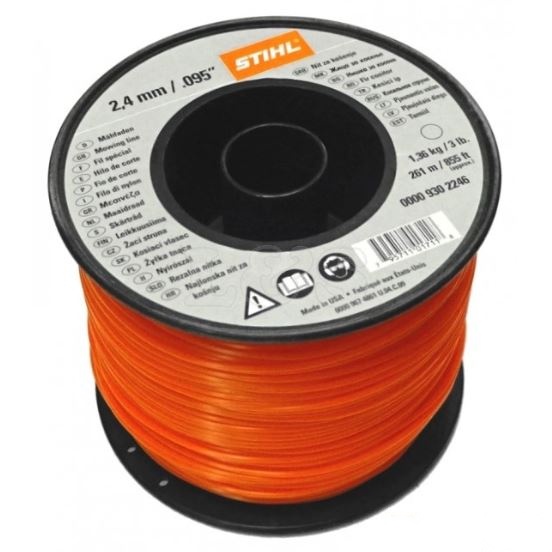 Čtvercová žací struna, průměr 2,4 mm, délka 261 m, oranžová, vyrobena z odolného a elastického materiálu.