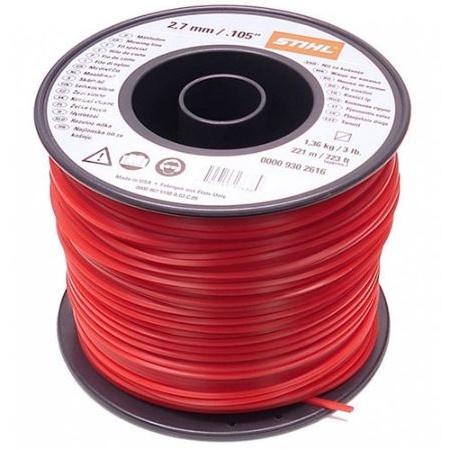Čtyřhranná žací struna, průměr 2,7 mm, délka 221 m, červená, vyrobena z odolného a elastického materiálu.