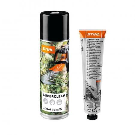 Pravidelné čištění a péče o nůžky na živé ploty lze provést rychle pomocí sady Care & Clean Kit a podpoříte tak životnost vašich nůžek na živé ploty. Pokud chcete ušetřit peníze na údržbě nůžek na živé ploty, stojí za to využít výhod našeho balíčku. Ten zahrnuje 300 ml Superclean a 80 g Multilub. To vám umožní vyčistit a pečovat o vaše nářadí STIHL a současně ušetřit peníze ve vaší peněžence.